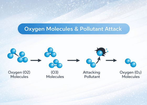 Ozone is a powerful oxidant and bactericide and is sometimes called “activated oxygen”, or “triatomic oxygen”, contains three atoms of oxygen rather than the two atoms we normally breathe. Ozone is an effective method for eliminating unpleasant odors in garbage/sewage treatment rooms, grease and oil mist in cooking processing areas and other areas where odor is a problem. However in cases where a lot of smoke and oil mist are generated during the cooking process the use of an electrostatic air cleaner is recommended.