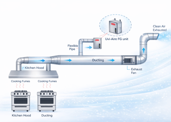 UVIAIRE’s FGD unit is an Ozone Generator producing high volume of ozone via the corona discharge method. Air is drawn through a blower fan across the corona plates powered by high tension transformers. The oxygen in the air is converted into ozone which is discharged through the 100mm diameter nozzle into the desired area where the ozone reacts with contaminants. A hydrophobic prefilter ensures dry clean air being fed to the corona discharge plates. All the electronic components and power supply are in a separate compartment, out of the air stream.